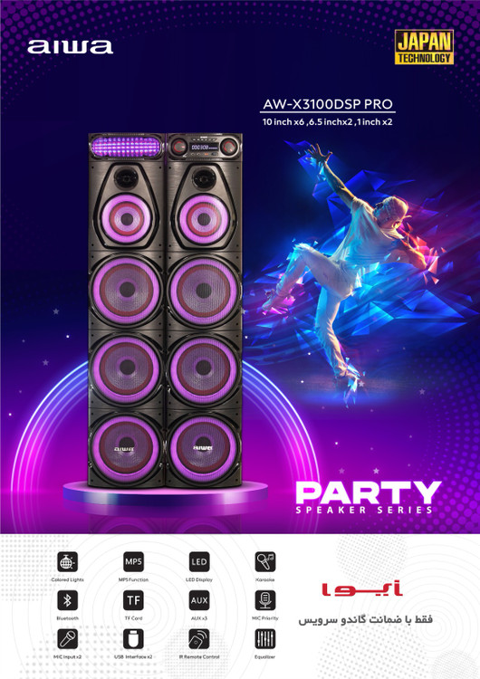 اسپیکر آیوا مدل X3100DSP یک محصول پیشرفته و قدرتمند است که تجربهی صوتی شما را به یک سطح جدید ارتقا میدهد. با توان خروجی 135×2 وات RMS، این اسپیکر قادر است صداهای با کیفیت و قدرتمندی تولید کند. واحدهای صوتی متنوع از جمله 6 سابووفر 10 اینچی، 2 میدرنج 6.5 اینچی و 2 تیوتر 2.1 اینچی به شما امکان میدهند تا لذت چندبعدی از موسیقی و صدا را تجربه کنید. این اسپیکر از قابلیتهای اتصال بینظیری از جمله بلوتوث، ورودیهای AUX، USB، اپتیکال و کواکسیال برخوردار است. با صفحه نمایش دیجیتال و کلیدهای کاربری، کنترل میزان صدا و تنظیمات به راحتی انجام میشود. ویژگیهای Echo Control و Boss Boost Function همچنین امکان بهینهسازی صدا و ایجاد تجربهی گوش دادن منحصربهفرد را فراهم میکنند. با حداکثر برد 300 متر و وزن 27 کیلوگرم، این اسپیکر مناسب برای محیطهای مختلف از جمله کنسرتها، جلسات کنفرانس و حتی استفاده در فضاهای باز میباشد.از دیگر ویژگیهای این اسپیکر باید به رقص نور چند رنگ، صفحه نمایش دیجیتال، ریموت کنترل که باعث سهولت در استفاده از محصول میشود و...اشاره کرد. AW-X3100DSP PRO یک انتخاب عالی برای علاقهمندان به صدای با کیفیت و تجربهی صوتی حرفهای است.