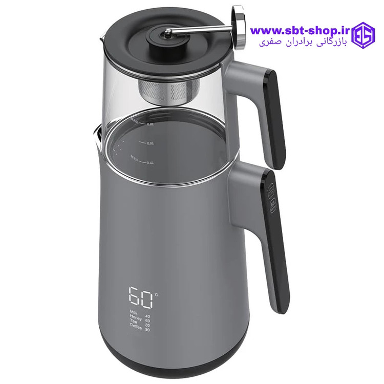 جنس قوری : دارای قوری شیشهای که امکان مشاهده میزان آب و وضعیت آمادهسازی را فراهم میکند.