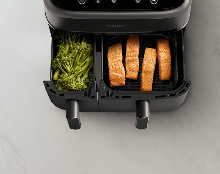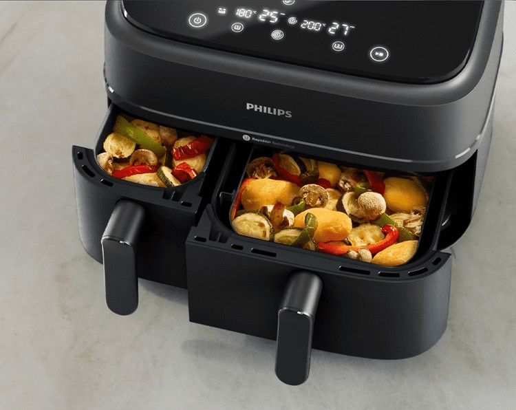 با استفاده از این سرخ کن فیلیپس، می توانید دو غذای مختلف را به صورت همزمان در دو سبد مجزا پخت کنید. این ویژگی حجم زیادی از غذا را به سرعت آماده می کند. همچنین، میتوانید تنظیمات مختلفی برای هر سبد اعمال کنید. استفاده از این سرخ کن دوقلو فیلیپس منجر به پخت غذاهای ترد و خوشمزه می شود.