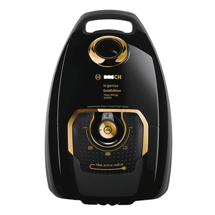 موتور جاروبرقی BGL8GOLDIR بوش بسیار قدرتمند و کم صدا میباشد و توان مصرفی آن 2200 وات است. تکنولوژیIn ‘genius Gold Edition که در این جاروبرقی تعبیه شده، یک تمیزی فوقالعاده را برای شما به ارمغان میآورد. سیستم Power Protect طراحی شده توسط شرکت سازنده با60 درصد قدرت مکش بیشتر باعث میشود تا با جریان هوای عالی، برای عملکرد تمیز کردن، شما جاروکشی پرقدرتی را داشته باشید، همچنین وجود این سیستم باعث افزایش مکش جاروبرقی در زمان نیمه پر بودن کیسه می گردد. سیستم Quattro Power عملکرد بسیار عالی در مکش دارد که باعث نتایج عالی در جارو کردن با مصرف انرژی کمتری میشود. این جاروبرقی دارای موتور کمپرسور HiSpin با تیغه های ایرودینامیک و کاملا کالیبره یکی از کم مصرف ترین جاروهای موجود در بازار است. فیلتر این جاروبرقی هپا (HEPA) میباشد که با ویژگی بالا برای عملکرد بهتر، تمام گرد و غبار را به خوبی به خود جذب می کند و مانع از پخش شدن در محیط میشوند و هوای خروجی 99 درصد بدون ذرات آلرژیزا هستند. همچنین این فیلتر قابل شستشو میباشد. پارویی این مدل جاروبرقی بوش مجهز به Air Bumper است که از ایجاد خطوط سیاه روشن روی مبلمان و از ایجاد خط و خش روی سطوح جلوگیری میکند. حجم کیسه گرد و غبار این مدل جاروبرقی 5 لیتر میباشد که این حجم باعث میشود شما ماه ها از یک کیسه استفاده کنید و در هزینه خرید مداوم کیسه صرفهجویی کنید. پاکت مصرفی این مدل جاروبرقی بوش تیپ G میباشد. وجود 5 عدد کیسه اضافی داخل جعبه دستگاه و برخورداری از شلنگ کنفی از دیگر مزایای این جاروبرقی بشمار میآید. لوازم جانبی همراه جاروبرقی شامل 3 ابزار حرفهای میباشد که شامل برس اثاثیه، برس بسیار بلند درزها و برس سری حرفهای که مجهز به سیستم Silence Sound است که باعث عملکرد بیصدا و آرام میباشد. لوله خرطومی این جاروبرقی بسیار باکیفیت است و به راحتی پاره نمی شود و تغییر شکل نمیدهد. این جاروبرقی بوش با دارا بودن لوله پلاستیکی تلسکوپی خود مناسب هر کاربری میباشد زیرا میتواند به راحتی لوله جاروبرقی را بلند و کوتاه کند. دسته این مدل جاروبرقی ارگونومیک میباشد که باعث سهولت در استفاده از آن میشود.