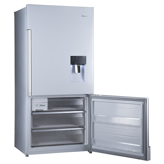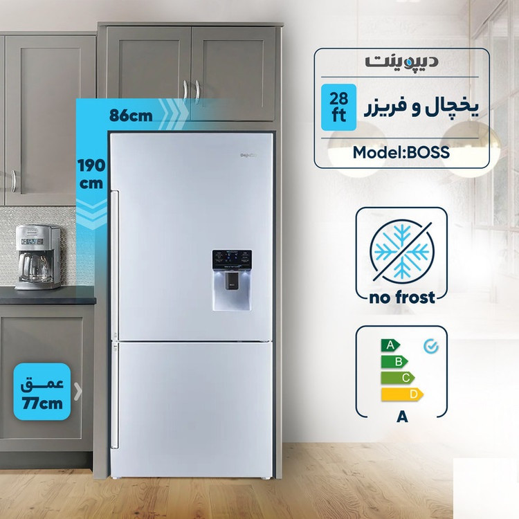 یخچال و فریزر 28 فوت دیپوینت مدل BOSS یکی از محصولات باکیفیت و پرطرفدار بازار است که با طراحی کاربردی و ویژگیهای مدرن خود، گزینهای ایدهآل برای خانوادههای پرجمعیت به شمار میآید. این مدل از نوع کمبی یا فریزر پایین (BMF) بوده و با ابعاد استاندارد شامل ارتفاع 190 سانتیمتر، پهنای 86 سانتیمتر و عمق 77 سانتیمتر بهراحتی در آشپزخانههای متوسط و بزرگ جای میگیرد. نمودار مصرف انرژی این دستگاه نشاندهنده بهرهوری بالا با گرید A است که به کاهش هزینههای برق کمک میکند. ظرفیت کلی دستگاه دیپوینت مدل BOSS 572 لیتر (معادل 28 فوت) بوده که 427 لیتر آن به یخچال و 145 لیتر به فریزر اختصاص داده شده که دارای سه طبقه داخلی و سه طبقه روی درب، به همراه یک کشو است و امکان دستهبندی و ذخیره مواد غذایی بهصورت منظم را فراهم میکند. فناوری نوفراست (بدون برفک) در این دستگاه از تشکیل یخ جلوگیری کرده و نیاز به تمیزکاری مداوم فریزر را از بین میبرد. فریزر هم شامل سه کشو و سه طبقه روی درب است و باقابلیت انجماد سریع، امکان حفظ کیفیت مواد غذایی را در کمترین زمان ممکن فراهم میکند. سیستم سرمایش دوگانه یخچال و فریزر 28 فوت دیپوینت مدل 28 فوت BOSS ، هوای سرد را بهصورت جداگانه در هر دو بخش مدیریت کرده و به حفظ طراوت مواد غذایی کمک میکند. سیستم گردش هوای داخلی هم با توزیع یکنواخت هوا، دمای مطلوب را در تمام نقاط دستگاه تضمین میکند. ویژگیهای دیگری نظیر آبسردکن با اتصال مستقیم به شیر آب، قفل کودک و فیلتر بوگیر، این مدل را به انتخابی مناسب برای خانوادههای امروزی تبدیل کرده است. همچنین صفحه سرمایش فلزی (Metal Cooling) به نگهداشت بهتر دما کمک کرده و عملکرد ECO مصرف بهینه انرژی را تضمین میکند.