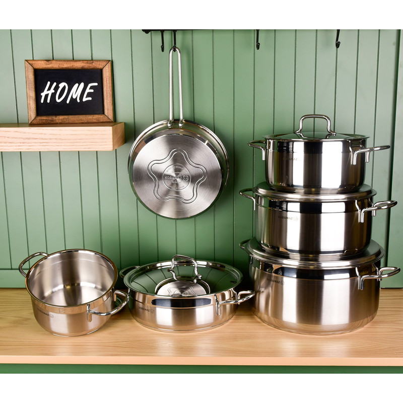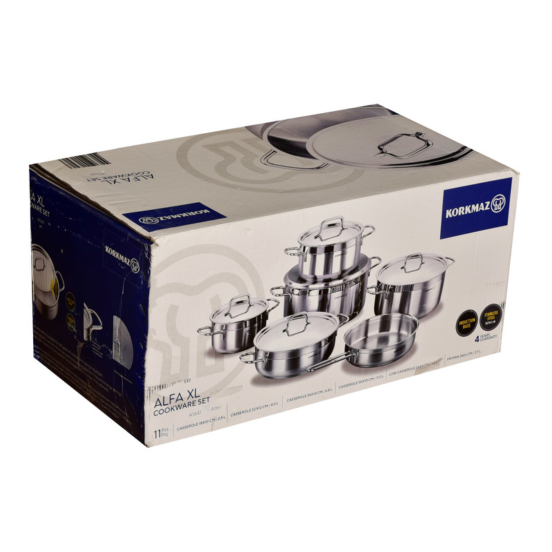 سرویس قابلمه یک وسیله اساسی و پرمصرف و از ضروریات هر خانه است و هر خانم خانهداری به دنبال این است که زیباترین، بادوامترین و سالمترین آن را انتخاب و خریداری نماید. در حالت ایدهآل، ظروف آشپزی شما باید از مادهای بیاثر ساخته شده باشد. پس پیشنهاد ما به شما سرویس قابلمه 11 پارچه کرکماز مدل Korkmaz Alfa XL A1641 است.استیل به کار رفته در سرویسهای قابلمه کرکماز بسیار با کیفیت و از مواد اولیه بهداشتی تهیه شده است. این ماده یکی از بهداشتی ترین و سالم ترین مواد برای ظروف پخت و پز بعد از فولاد ، پرسلان و شیشه است. استیلی که می توانید با خیال آسوده مواد غذایی را در داخل آن قرار داد.دستگیرههای این سرویس قابلمه از جنس استیل ضد زنگ و نسوز میباشند. طراحی ارگونومیک دستگیرهها و اتصال محکم آنها به بدنه موجب استفاده راحت و ایمن از آنها شده است.کف قابلمه استیل 1641، دارای کف سه لایه جهت انتقال یکسان حرارت ، قابل شستشو در ماشین ظرف شویی و قابل استفاده بر روی انواع اجاق گاز القایی، شیشه ای، برقی، سرامیکی و به خصوص گازی می باشند.
